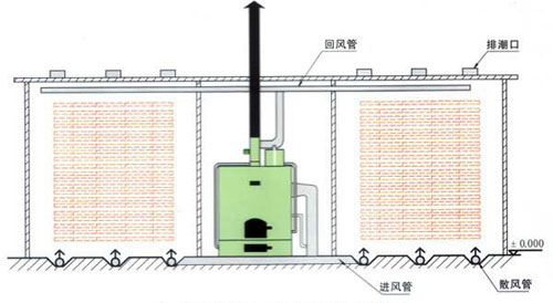 熱風式烘干設備工作原理是利用燃燒產生的熱能,加熱窯內的空氣,由熱風爐頂部主風機將窯內的空氣通過管道吸入爐體,將空氣加熱。再通過管道,送入窯內,由窯內的循環風機不斷的循環對窯內的木材均勻加熱。木材烘干過程中如需要蒸汽,可由熱風爐內的蒸汽發生器提供,如果是一爐兩房時,管道上裝有插閥,通過插閥的調節來控制窯內的溫度。在烘干的過程中,由于木材要進行排濕,在窯頂上留有排濕孔。